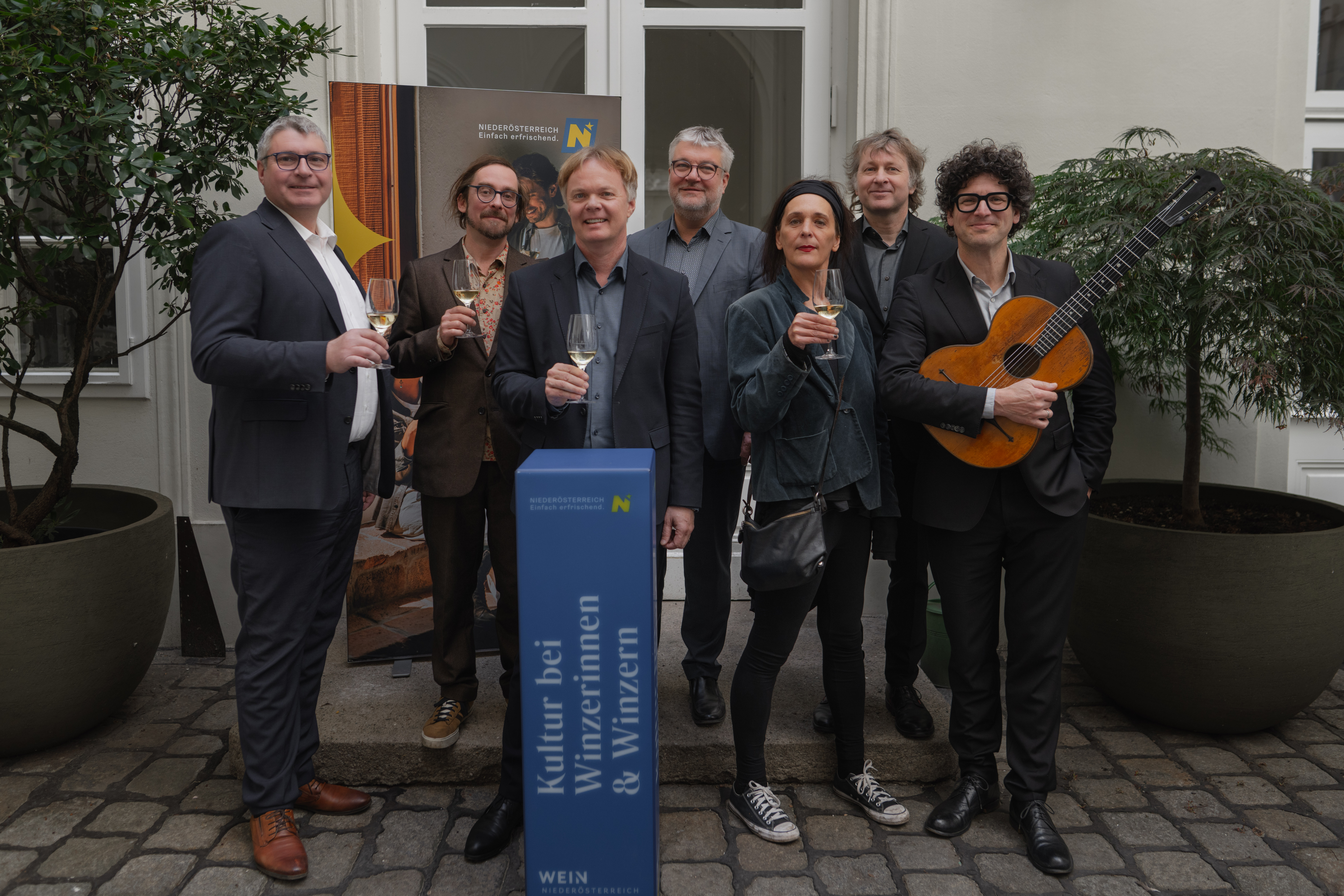 Pressefoto: v.l.n.r.: Weinbaupräsident Reinhard Zöchmann, Kurator Stephan Sperlich, Michael Duscher – Geschäftsführer Niederösterreich Werbung, Martin Grüneis - stv. Leiter der Abteilung Kunst und Kultur, Land Niederösterreich, Kuratorin Tini Trampler, Klemens Lendl und David Müller („Die Strottern“)